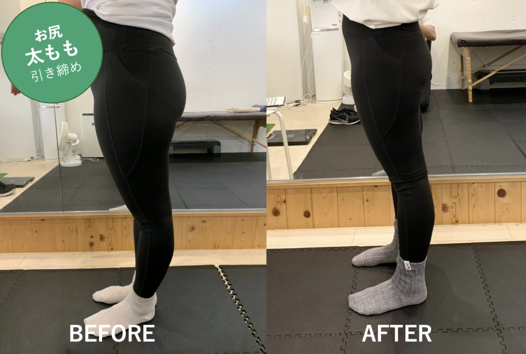 約3ヶ月でお尻と太ももの前も小さくなりました!!反張膝でしたが、外くるぶしから膝のラインが真っ直ぐに変化!足首もだいぶ柔らかくなってきています!!